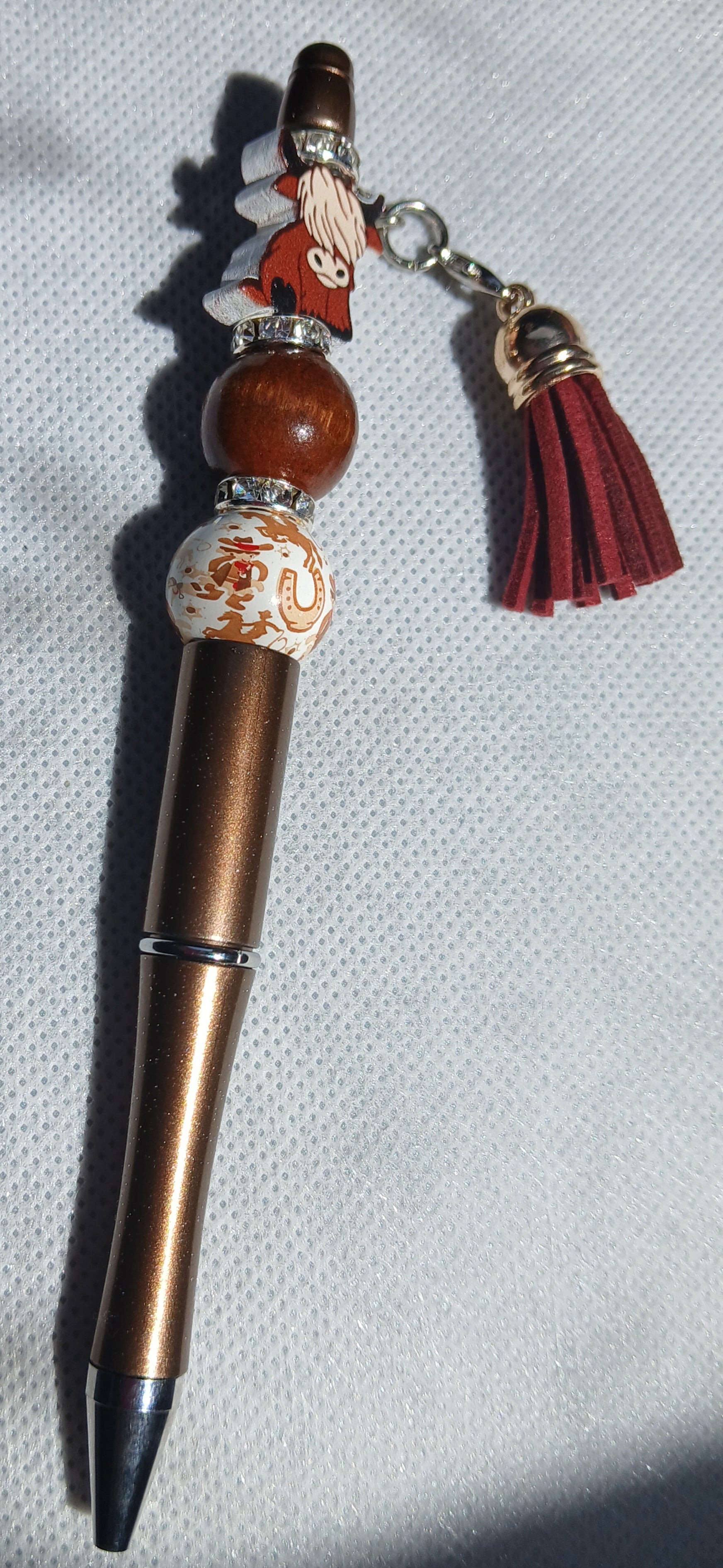 Cute brown pen with beads and a cow.
