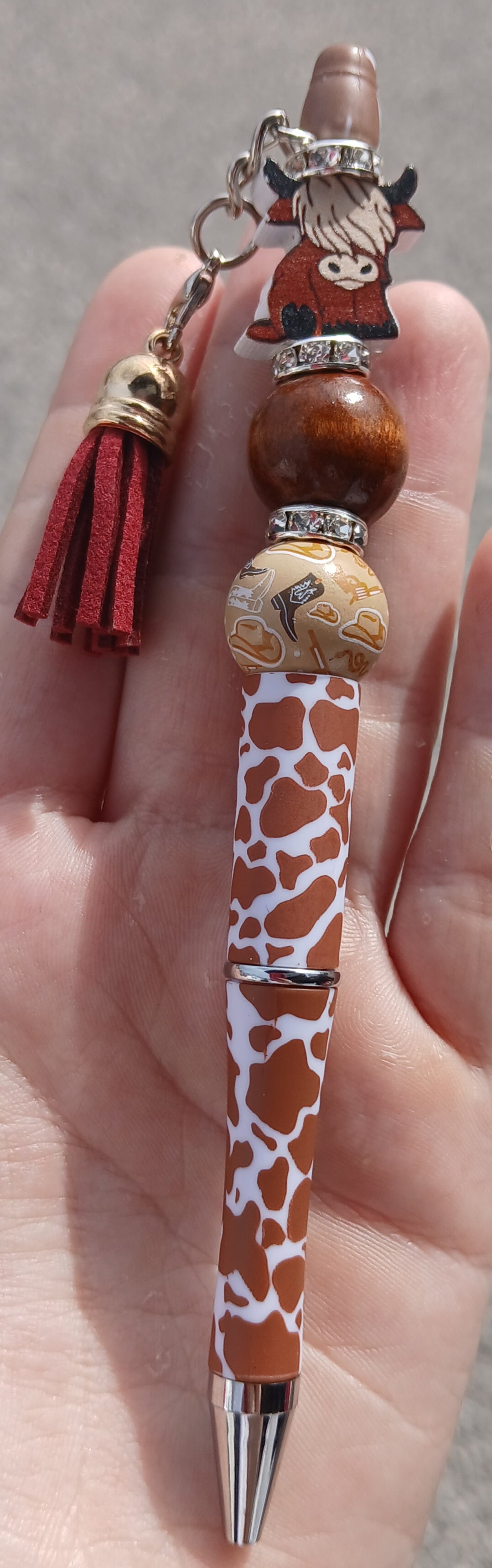 Brown cow print pen with a cow and beads.
